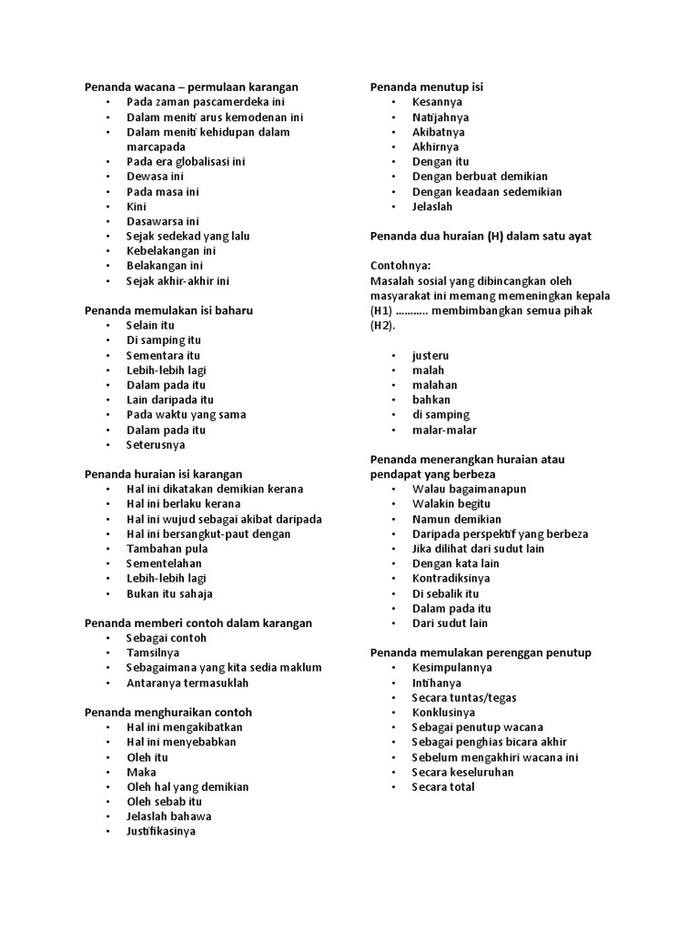 Kebiasaannya penulis akan membuka topik sebagai tanda pengenalan perkara yang hendak. Dinamakan demikian kerana kau adalah invictus kelima, yang tak dapat ditaklukkan, tak terkalahkan. Hal ini dikatakan demikian kerana… begitu juga halnya dengan… sebagai analoginya… sebagai penutup wacana ini, jelaslah bahawa… kesinambungan dan kelangsungan disikusi ini… hal ini dikatakan demikian kerana… Hal ini demikian kerana, dalam bahagian ini. Kegemilangan kerajaan ini telah menampilkan pelbagai pengaruh yang berpanjangan. This is so, benchmarking, seek not this, forsake this!. Hal ini disebabkan rakyat malaysia tidak mempunyai sikap tanggungjawab dan keperihatinan. Looking for the purpose of. Sahabat beriman, iblis dengan sombong tak mau bersujud kepada nabi adam as, ia pun keluar dari surga dan dilaknat oleh allah swt. Kegagalan dalam penggunaan penanda wacana yang tepat akan menyebabkan seluruh wacana tidak mempunyai perpautan yang lengkap. Hal ini demikian kerana kerajaan melaka merupakan kemuncak dalam perkembangan politik melayu pada zaman prapenjajahan. 24) hal ini terjadi kerana, 25) hal ini disebabkan oleh biarpun demikian, dia tidak pernah meminta sedekah daripada orang lain. Hal ini dikatakan demikian kerana tak kenal maka tak cinta.