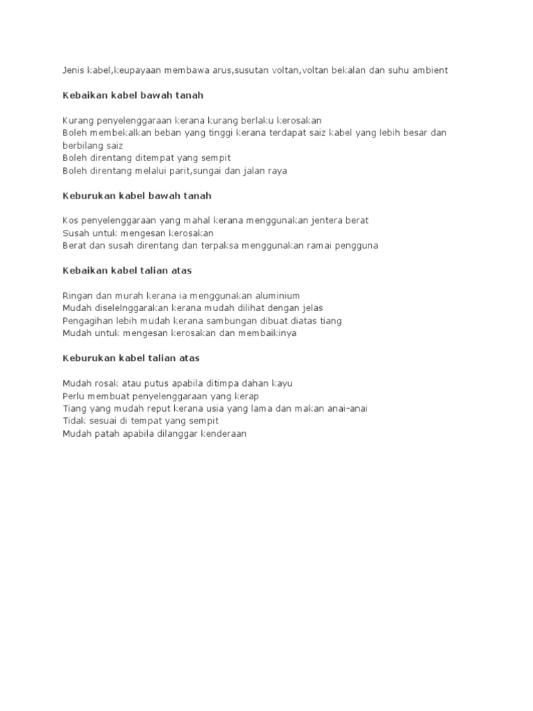 Pastikan wire pendek dan sambungan. 4.1.2.3 pemasangan talian meliputi merenggang (tensioning), tegang bunuh (killing tension), lendut (sagging) dan had kelegaan (clearance). Peranan, saiz fizikal dan fungsi psu adalah bergantung kepada keupayaan membawa arus, kegunaan psu itu sendiri serta apakah yg hendak dikawalnya. 4.1.2.4 aksesori seperti talian poles fuses, penangkap kilat (lightning arrestors), pendakap d (d bracket). Denganitu keupayaan membawa arus bagi kabel juga berubah(berkurangan). Penyambungan dan tamatan (joints and terminations). Suhu memberi kesan kepada rintangan padapengalir kerana suhu berkadar terus dengan rintangan (t r)↔dan rintangan berkadar songsang dengan arus (r 1/1). Untuk membantu anda memulakan pendawaian permukaan anda perlu mengenalpasti litar skematik dan lakaran litar pendawaian. Kriteria ini digunakan supaya bahagian rentas kabel boleh membawa arus beban yang diperlukan secara terus kapasiti litar pintas dihadkan oleh keupayaan suhu maksimum penebat. Rozlan razali 4:31 pgkeupayaan kabel. Mereka juga menyuarakan tentang keupayaan negara menyelenggara kabel dasar laut kerana kapal yang ada sekarang bukanlah kapal pun. Label ini sebenarnya saiz pengalir bagi kord boleh lentur di anatara 0.5 mm2 hingga 4 mm2 dan keupayaan membawa arus sehingga 5 hingga 40 ampiar sahaja. Saiz kabel mampu membawa arus beban tanpa memanaskan kabel;
