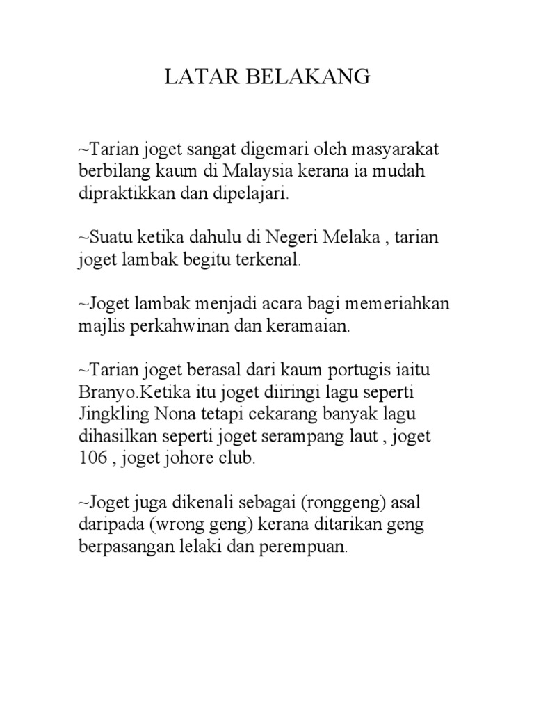 Joget adalah berasal dari tarian portugis branyo. Sudah sejak lama, mulai zaman dahulu hingga zaman modern sekarang ini musik menjadi pelengkap hidup manusia. Riau adalah provinsi di indonesia yang dalam tradisi riau, gong digunakan untuk mengiringi tarian, joget, seni suara, dan lainnya. Alat musik jambi memiliki ragam yang unik dan khas, setiap alat musik tradisional ini memiliki latar belakang yang unik dan luar biasa. Bharathanatyam tarian joget tarian joget merupakan sejenis tarian melayu tradisional. Jika ini kurang cocok silahkan. Alat musik pengiring tari joget lambak adalah rebana. Pada prinsipnya, segala sesuatu yang memproduksi suara, dan dengan cara tertentu bisa diatur oleh musisi, dapat disebut sebagai alat musik. Bedug merupakan instrumen musik tradisional yang telah digunakan sejak ribuan tahun lalu, yang memiliki fungsi sebagai alat komunikasi tradisional, baik dalam kegiatan ritual keagamaan maupun politik. Bukan cuma karena namanya yang unik, tapi juga peranannya yang juga sentral alias penting dalam perangkat contohnya adalah tarian joget bumbung dan juga penyambutan tamu dalam acara nikahan bali. Alat musik ini kerap digunakan untuk mengiringi tarian spanyol misalnya tari flamenco. Tarian joget dahulu ditarikan dengan iringan lagu portugis seperti jingling nona. Sedangkan penari pria menggunakan baju jurung cekak, kain songket, plekat, dan kopiah.