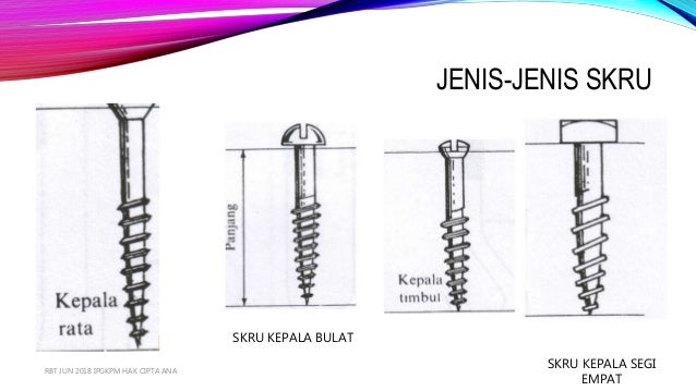 Skru kepala rata countersink jika anda menggunakannya. Pan kepala (skru logam lembaran): Mempunyai tirus dari 8 hingga 10 ulir skru dan digunakan pada permulaan mengulir. Boleh digunakan ke atas dua bahan yang berbeza. Skru alur rata, kepala benam dan kepala bulat.